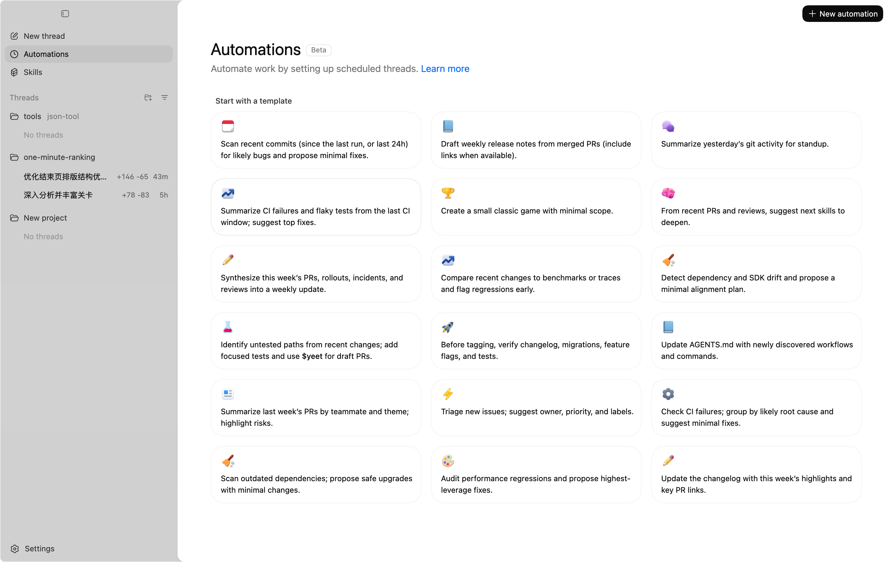 Automations(自动化工作流):在后台自动执行重复性任务。Codex 会将调查结果添加到收件箱,如果没有需要报告的内容,则会自动归档任务